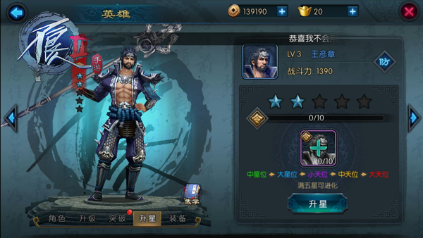 初始角色的星位为中星位,但是根据后续招募的武者资质不同,武者的星位也有所不同,通过升星可以使您的英雄将越来越强,最高可升至大天位哦