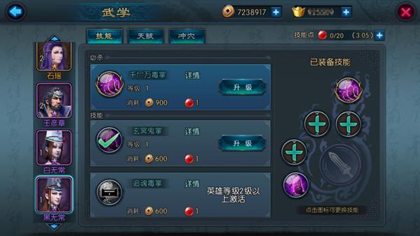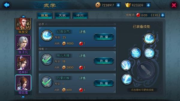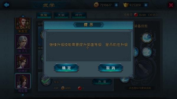 在游戏中,技能的等级提升需要消耗铜币以及技能点,技能点满值为20点,消耗后可跟随时间流逝而恢复。并且,技能的等级受到角色等级的限制(如:角色等级为x级,则技能等级只能升到x级)。