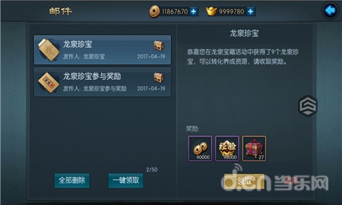 邮件查收龙泉宝藏玩法中的通过拾取龙泉珍宝自动兑换的超值奖励