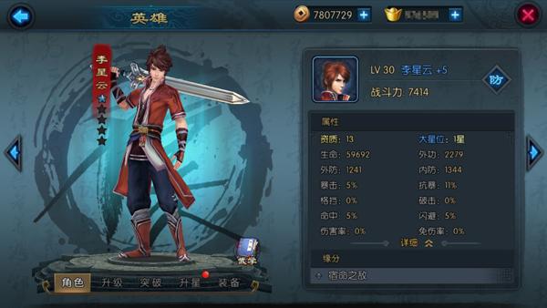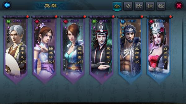 游戏内英雄根据资质划分为三档,资质越高,升级时属性的成长越高,战斗力提升也越为明显。当前版本中包含:外攻、外防、内攻、内防、暴击、格挡、命中、闪避、免伤等属性。