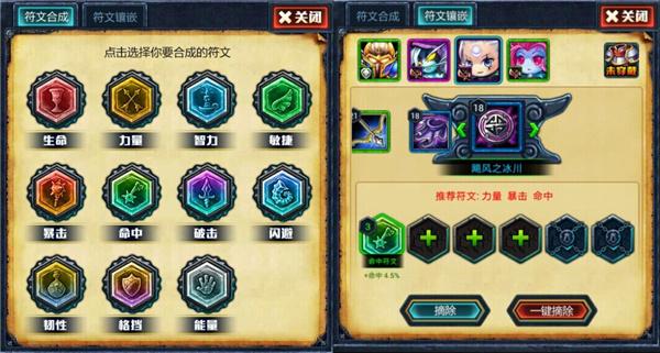 给英雄最强的符文,《天天女神》中符文搭配是学问,但是光有合适的符文不够,还必须提升符文等级才能获得更强的效果。目前游戏里符文一共有12个等级,等级越高符文增加的属性越多,小伙伴可以通过“合成”将三个属性相同、等级相同的符文进行更高一级的合成,合成几率为100%,不用担心失败什么的。