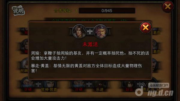 所谓名正言顺,要合体首先得有证才行。天拓游戏《三国名将》的游戏里,玩家要开启合体技能必须先完成69级传承任务才行,之后玩家可以根据游戏提示选择不同的组合激活合体技能。激活后的组合,玩家只要安排上阵就行,这里要记住,组合必须同时上阵,不然可是发动不了合体技能的。同时所有激活后的组合,还能通过使用兵法秘籍提升合击等级,等级越高,触发武将合击的概率越高!