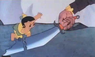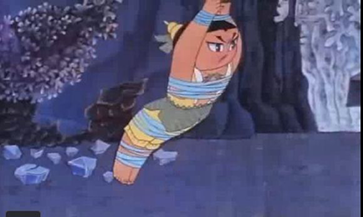 魔镜被三娃破坏,蛇精用剑猛砍三娃,却丝毫不顶用。但最后蛇精采用以柔克刚的方式,把三娃擒住。三娃挣不断刚柔阴阳剑。
