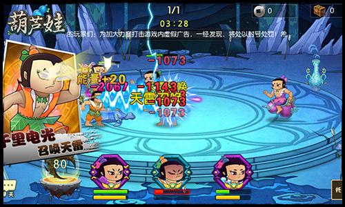 金鼠闹新春,1月15日-1月24日,上线就送VIP! 巍峨的葫芦山里关押着蛇精和蝎子精,一只莽撞的穿山甲打穿了山洞,妖精们趁机逃出山洞,为祸人间。只有七彩葫芦,可以消灭妖精,还世间一片清明! 七彩葫芦化身七个葫芦娃,他们各个身怀绝技。劈山裂地、千里电光、金钟守护,酷炫神技,华丽特效,默契配合,技能无缝衔接,与好友实时互动,与团队协同作战,勇闯百余关卡! 【葫芦娃】是一款横版动作策略手游,重温童年经[详情]