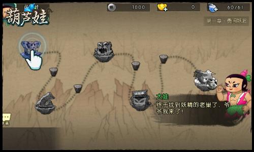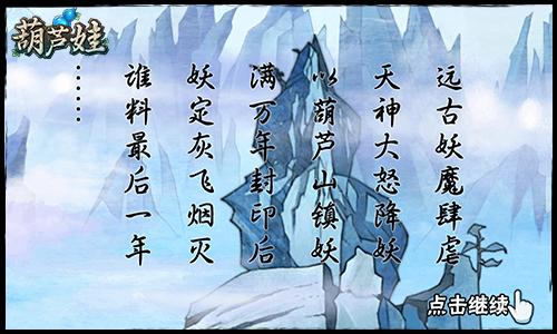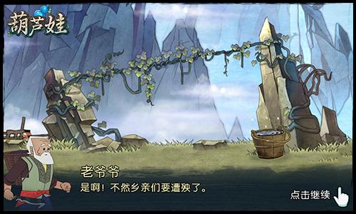 玩家们进入游戏,初始剧情首先交代了蛇蝎二妖逃走的剧情,然后老爷爷因为“种植”葫芦娃而惹祸上身,随后被妖精们抓去了,毕竟妖精们的共性就是欺负弱小嘛。不过好在大娃及时“成熟”了起来,然后第一个闯入了副本之中去救爷爷。