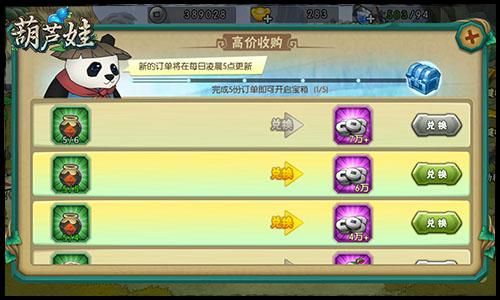熊猫商人坐落在农场的右上角,点击即可进入它的高价收购系统,每一天熊猫商人会发出5笔订单,如果玩家可以生产出订单的物品,点击“兑换”就可以获得大量的银币或经验啦!