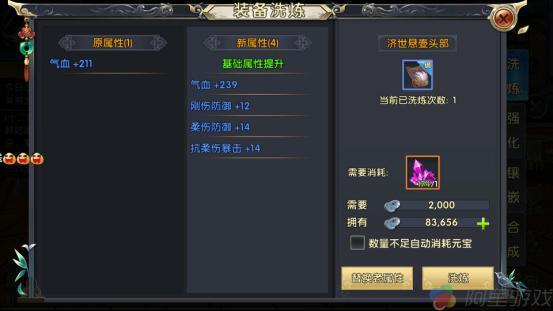 装备洗练只需要足够的洗练石和银币即可,放心的是洗练每次都是100%成功(测试阶段是的)。只要新的属性比之前高就可以替换成更高的属性。