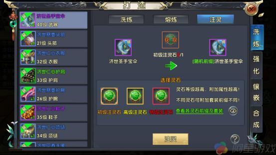 另一种可以增加属性的功能是“注灵”,同样是选定装备后配合不同等级的注灵石即可获得不同前缀开头的装备。