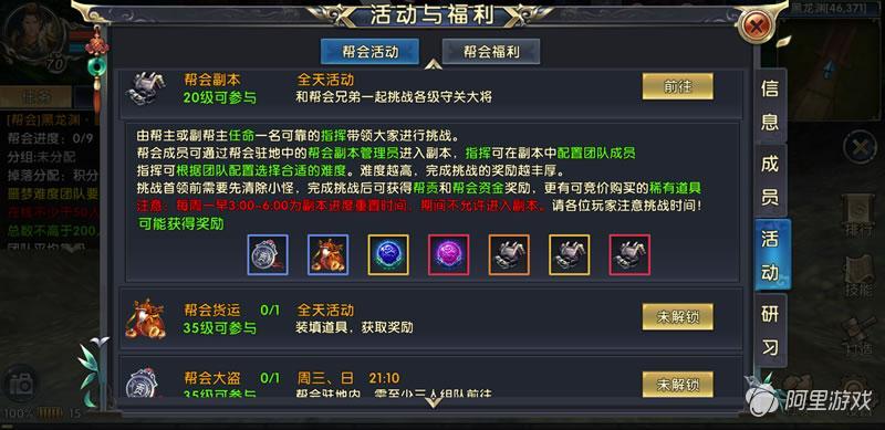 帮会副本是一个帮会活动,玩家要想参与必须达到20级加入帮会才行。活动全天开启,由帮主或副帮主任命一名可靠的指挥带领大家进行挑战。帮会成员可通过帮会驻地中的帮会副本管理员进入副本,指挥可在副本中配置团队成员,同时也可根据团队配置选择合适的难度。难度越高,完成挑战的奖励越丰厚。在副本中挑战首领前需要清除小怪,完成挑战后可获得帮贡和帮会资金奖励。更有可竞价的稀有道具。