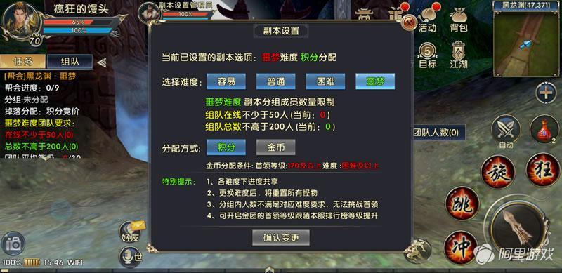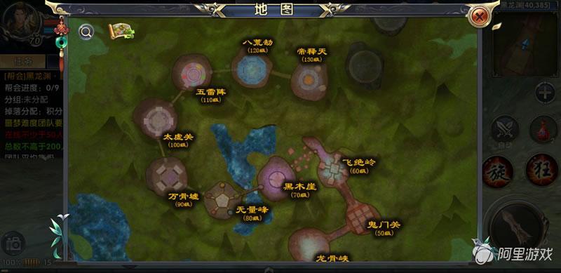 帮会副本分为龙骨峡、鬼门关、飞绝岭、黑木屋、无量峰、万骨墟、太虚关、五雷阵、八荒劫、帝释天等等总共17个部分,从40级开始到170级,每十级开放一个。每个副本都可以设置难度,从容易、普通、困难到噩梦不等。通关后所有参与玩家系统会自动分配积分。如果可击杀首领等级等级在170及以上,难度在困难及以上可获得金币奖励。可开启金团的首领等级跟随本服排行榜等级提升