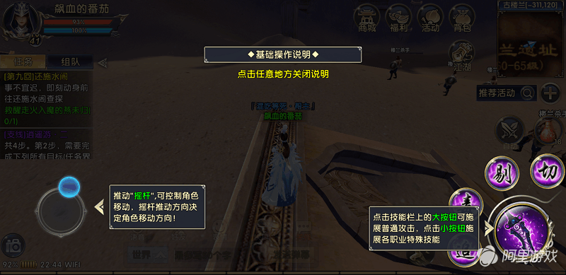 首先跟大家介绍一下游戏的基本操作是怎么样的。游戏界面中左边为固定摇杆,任意方向推动摇杆即可控制角色移动,摇杆推动方向决定角色移动方向。右边为技能栏,点击大按钮可施展普通攻击,周围环绕的四个小按钮可施展各职业特殊技能。《卧虎藏龙贰》整个游戏界面布局跟其他手游的布局类似,玩家在打开游戏之后并不会感到陌生,反而能快速熟悉如何对游戏进行操作。