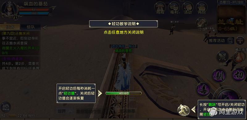 施展轻功的按钮在右边技能键的左边,平常作为跳跃功能存在。若是长按改按钮即可开启或关闭轻功功能,开启后再次点击跳跃即可施展轻功直接跃向空中。轻功一共有四个阶段,每提升一个阶段即可在空中多进行一次跳跃,在后期游戏中可以通过任务习得。轻功开启后每秒消耗一点“轻功值”,关闭后轻功值会逐渐恢复。
