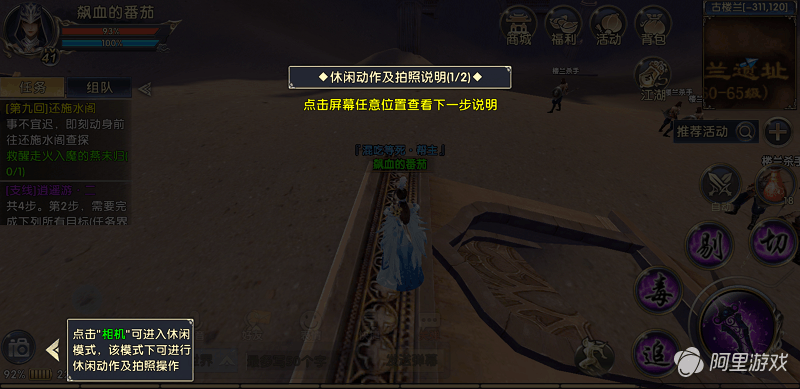 在游戏界面左下角有个“相机”按钮,玩家点击后可进入休闲模式,该模式下可进行休闲动作及拍照操作。玩家点击动作栏任意一个后即可执行,动作能双人执行,不过需要两人同时选中一个目标后才能进行。点击右边“照”即可进行拍照,所拍照片自动保存在手机相册中。