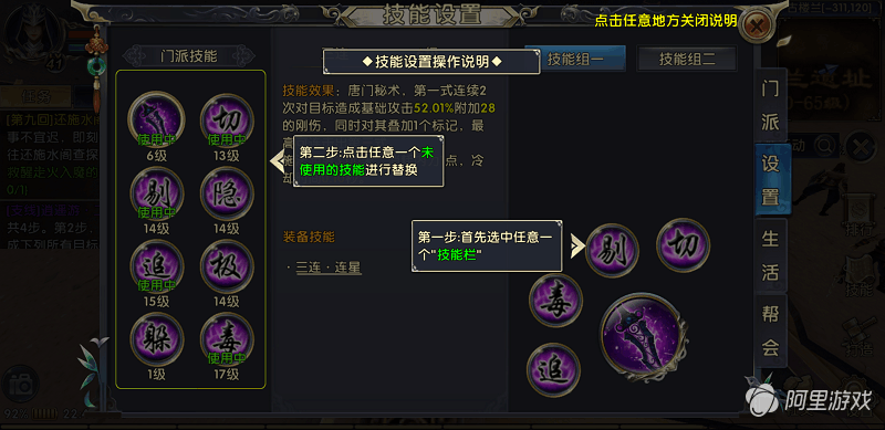 同样是点击右边“+”按钮找到技能系统,找到“设置”页签,打开后首先选中任意一个“技能栏”,然后点击一个未使用的技能进行替换即可完成技能设置。游戏为玩家准备了两个技能组,玩家可以根据不同需求来设置技能。