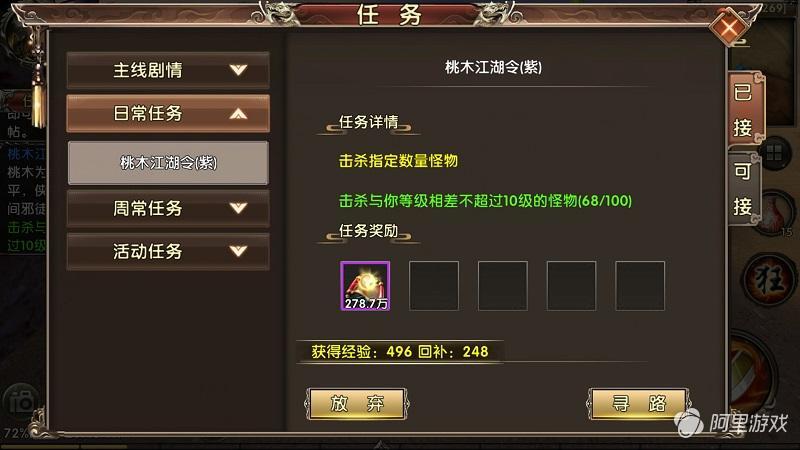 游戏充分为玩家着想,设定了一个十分人性化的功能,那就是离线经验的积累。若是玩家游戏玩够了选择下线,系统就会自动记录大侠离开的时间,在你离开的这段时间系统会积累你的离线经验,当你再次回到游戏的时候,这些经验就会通过完成任务发放,所以,在离开游戏的这段时间里,即使没有每日任务,也可以通过第二天的回补经验来弥补一定的损失,从而减少与别人的差距。