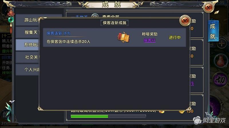 侠客连斩:在侠客岛中连续击杀20人。完成后会获得“侠客行”的称号。