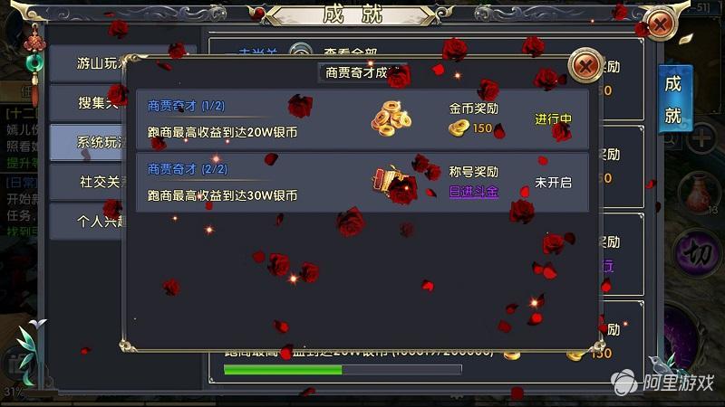商贾奇才分为两个部分:跑商最高收益达到20W银币;跑商最高收益达到30W银币.