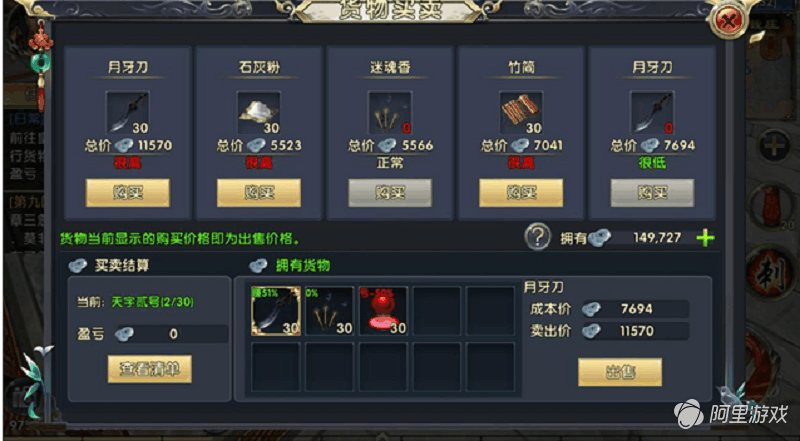跑商是游戏中最为刺激的经营活动,结合现实生活中股市的方式,让一件商品在不同的时间段都是价格不定的,大大提高了游戏的丰富性。