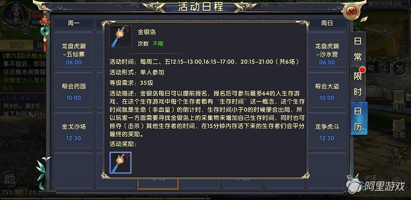 金银岛活动玩法为每周的特定时间段开启,主要是在每周二、周五中午过后分阶段开启,一共会举行六场。玩家需在当天提前以单人形式报名,报名条件为任务等级达到35级。点击右上角活动按钮后选择右侧“日历”按钮后选择金银岛报名,报名后会有二次确认。