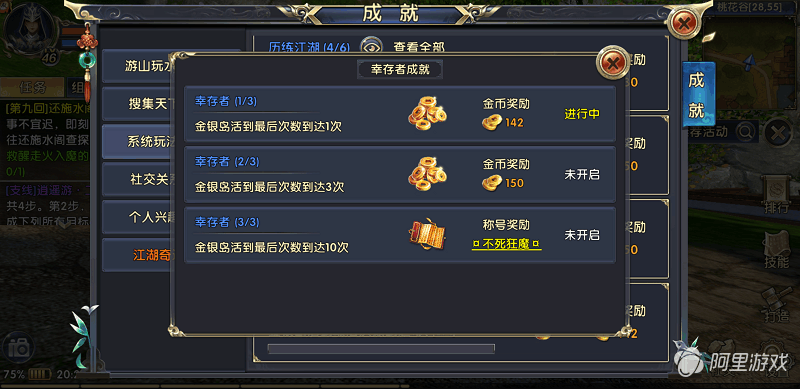 “幸存者”这个成就一共分为三个阶段进行,分别要求玩家在金银岛活动中保持活到最后的次数达到一次、三次和十次。全部完成后将获得稀有称号“不死狂魔”。接下来向大家介绍一下达成本次成就的活动——金银岛。
