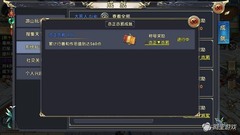 亦正亦邪成就需要“行善值和作恶值累计达到560点”,达成后还有称号奖励送给你。