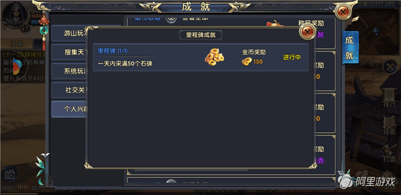 里程碑属于成就的个人兴趣部分,具体要求是要玩家在一天内采集50个石碑即可激活成就,同时还能获得额外金币奖励。这个成就总的来说应该是成就系统中最简单的,不花钱也不费力气,只要在一天内采满石碑就行,对于成就爱好者来说千万不要错过哦。那么如何去完成这个石碑采集的次数呢?这就是本文的介绍重点,接下来会详细说明。
