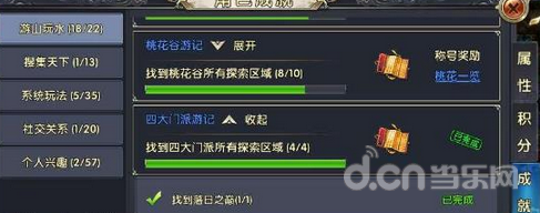 桃花谷游记、天南岭游记、昆仑山游记、皇城游记、燕云州游记、四大门派游记、古楼兰游记,每个成就都有不同的任务,且没有指引需要玩家自行探索。