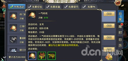 在这里给大侠们一个小小的提示,因为游戏中活动种类很多,不同的活动有不同的奖励,所以大侠们可以点击活动界面“我要经验”按钮,这里面的活动都是主要产出经验的,挑选其中自己喜欢的活动参加,升级将变得十分容易。