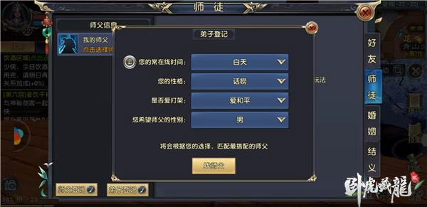 当玩家等级突破20级时即可开启师徒系统,在40级之前,玩家只可以进行拜师。40级之后既可以选择拜师,同时也可以去收徒。如果觉得在茫茫人海中发现合适的师父或徒弟有点困难,《卧虎藏龙贰》中的师徒匹配系统绝对可以让你高枕无忧。玩家使用师徒匹配系统,主动告诉系统一些自己对于师父或者徒弟的期望需求,例如填写自己的在线时间、性格、是否爱打架、师父性别等个人信息,系统自动会为你找到合适的人选。选择好师父后,由师父选择是否答应收徒。收徒则需要前往皇城师徒场所才能登记个人信息。