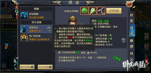 师徒系统是《卧虎藏龙贰》中非常重要社交系统之一。作为师父,自己的桃李遍天下,关键时刻还能一呼百应从者如云。作为徒弟则可以更快的熟悉了解整个游戏架构,从而有效避免多走弯路,如果行走江湖受到欺凌,还能呼唤师父和众师兄弟们强力来援。师徒系统是真正的双赢系统,各位大侠可不要轻易错过哟!