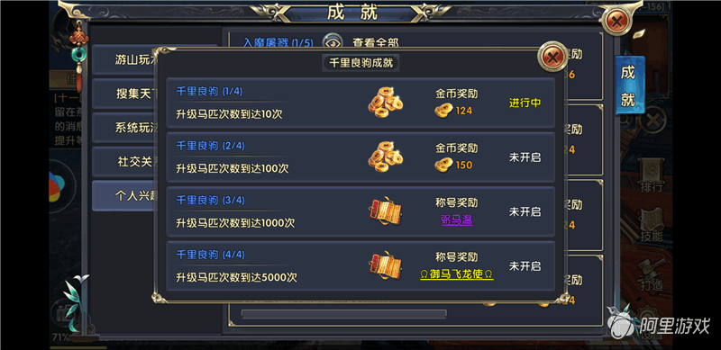 千里良驹属于成就的个人兴趣部分,具体要求是要玩家达到一定的马匹升级次数即可激活成就,同时还有“弼马温”、“御马飞龙使“称号等你拿。
