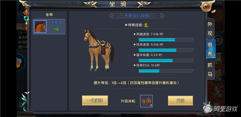 接下来就是马匹升级了,玩家在坐骑界面点击培养即可升级马匹。升级所需要的青草随等级的增加而增加,如果青草够的话玩家也可以选择一键满级。升级会提升坐骑的四项属性,这四项属性随等级提升随机增加。