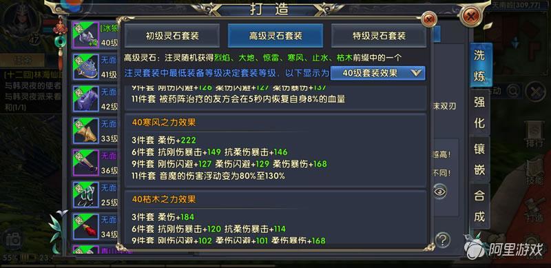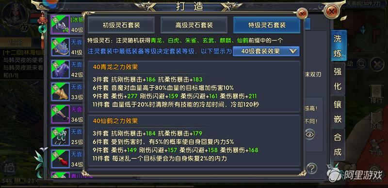 然后在看看特级灵石套青龙之力的效果,玩家穿戴三件套时增加双抗暴;六件套为音魔对血量高于80%血量的目标增加伤害10%;九件套时增加柔伤、刚伤闪避和柔伤闪避,同时提升柔伤暴伤;十一件套时在血量低于20%时清除所有技能的冷却时间,冷却120秒。这套装备提升的也是音魔技能,但是没有寒风之力套打出的伤害稳定,而且也只增加10%。在前期伤害明显,后期对手血量降低也就失去效果,推荐副本使用。而十一件套对于音魔有质的飞跃,在自身劣势的情况下能够打出一套爆发,这或许能是你完成绝地反击。