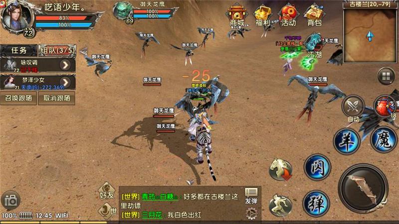 楼兰69级怪物特点是血少攻高、主动攻击,作为卧虎藏龙贰里面为数不多的主动攻击怪,这个龙鹰算是逍遥升级最好的去处了。你就站着不动,源源不断的龙鹰会飞往你的身边,68级之前逍遥挂机的首选,需要注意的是调好你的保护设置。