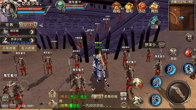 到了68级之后你就要为70级之后做准备了,来到这里楼兰73级叛军守卫,怪物密集,你只用站到图上我的位置不用动,点上挂机周围一圈的怪都会成为你的经验。关键一点这里可以打出来70之后需要的酒和令牌。最后做一个装备方面的补充,有条件的话可以洗出下面两条属性提升你的刷怪效率,增加音阵和震地的目标个数。