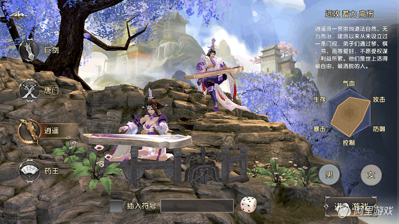 逍遥是远程法术攻击门派,招式华丽,控制爆发都很出色。同时具有蓄力和高强伤害,技能千变万化,气血、攻击、减伤、控制是主要特性。无论是在PVE还是PVP中,逍遥一直是一个进行远程控制并保证输出的职业,外加各种BUFF加成,往往能让你在战场外就带走敌人。本职业对玩家来说上手有一定难度,需要时刻注意走位拉开与敌人的距离,是个拼眼力和手速的职业。