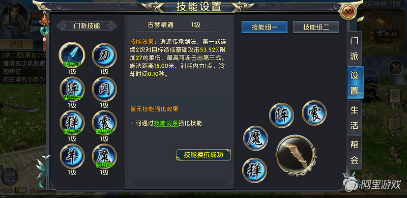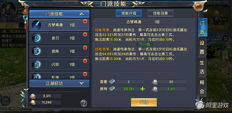 在技能专属经验不足的情况下,建议先对以下技能进行加点。首先是普攻技能古琴精通,必须加满。它的第一式连续两次对目标造成伤害并附加柔伤,最高可连击出第三式。虽说是一个单体锁定技能,但是其冷却时间短而且施法距离远,能让你安全的进行输出。
