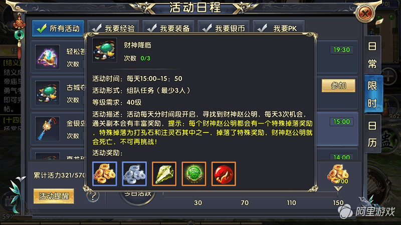 说到金币,似乎没有谁比财神更加的富有,财神奖励每天开启,可以参加三次,找到财神,通过考验,即可获得奖励,除了我们需要的金币,还可以获得银币、注灵石、熔炼石以及珍贵的打孔石,属于必做任务。
