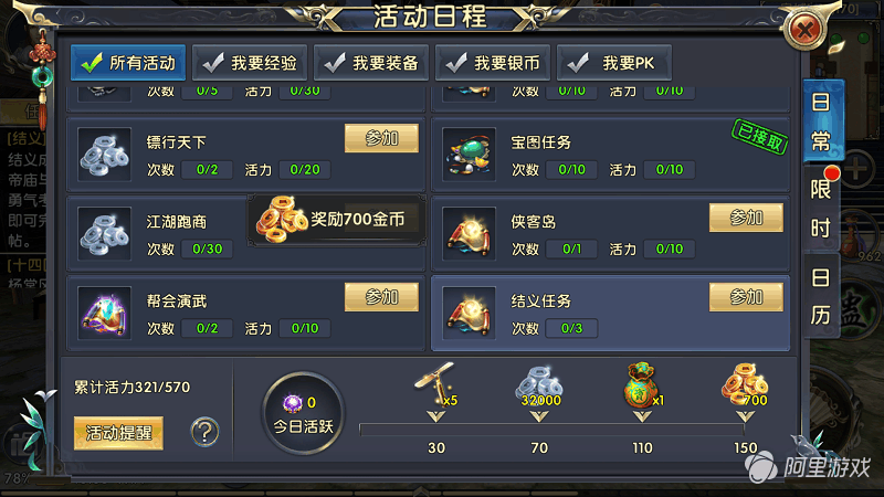 完成每日任务,可以获得活跃度,而活跃度达到一定数值,则可以获得各种奖励,活跃度达到150,则可以获得700金币的奖励,可以说是非常的丰厚。