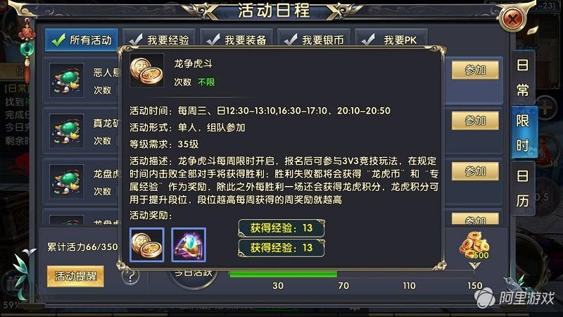 “龙争虎斗”是一个限时开放的活动,每周三、周日不同的时间段会开启活动。这其实是一个3v3的小型团战,规定时间内击杀对面全部玩家即可获取胜利。