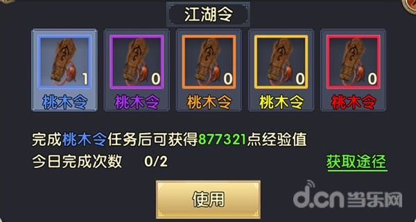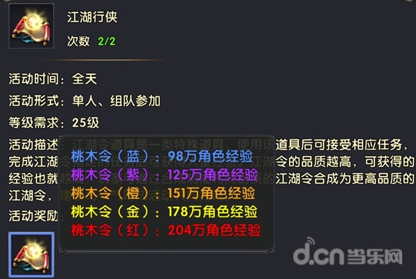 每次参与江湖行侠,会消耗一类特殊的道具——“江湖令”,试用之后将会接取任务,开启江湖行侠。完成江湖令指定的任务后就可获得大量的经验。经验的多少取决于江湖令品质的等级。蓝、紫、橙、金、红等级依次提升,经验奖励逐级递增。