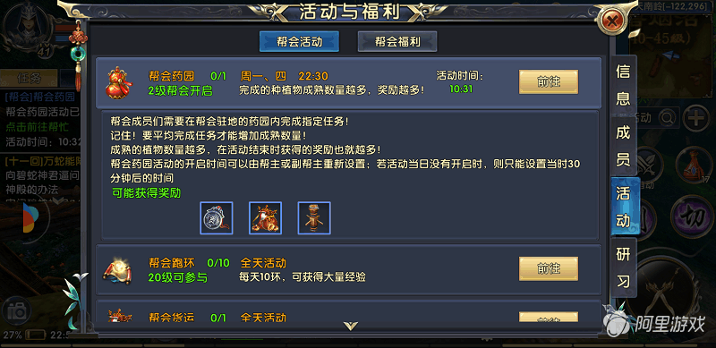 要想参与帮会药园活动,玩家就必须先达到20级才能加入帮会,之后所有帮会成员努力将帮会等级提升到2级才能开启。活动开始时间为每周一、周四晚上22:30,持续时间为半小时。帮会成员们需要在帮会驻地的药园内完成指定任务,任务完成的次数越多,成熟植物的数量也会越多,在活动结束时获得的奖励也就越多。那么究竟具体要完成哪些任务呢,接下来请看详细的参与流程。