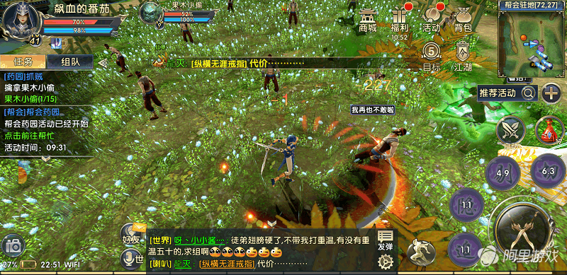 药园活动一共是四个任务,第一个就是抓贼。玩家可在药园中央大树下找到NPC南宫秋接取抓贼任务。任务接取后点击左边任务栏,系统会自动寻路到果木小偷所在的位置,之后角色便会自动寻找目标击杀。一共需要击杀15个果木小偷,难度不大一下子就能完成。