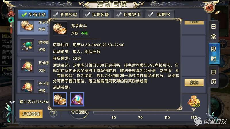 龙争虎斗,是3V3竞技玩法,全天不限时参加,每隔十分钟一场,单人或组队都可报名,报名成功后,玩家可以自行去做其他任务(但是不要下副本哦),竞技开始会有提示,点击即可进入赛场。