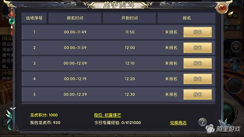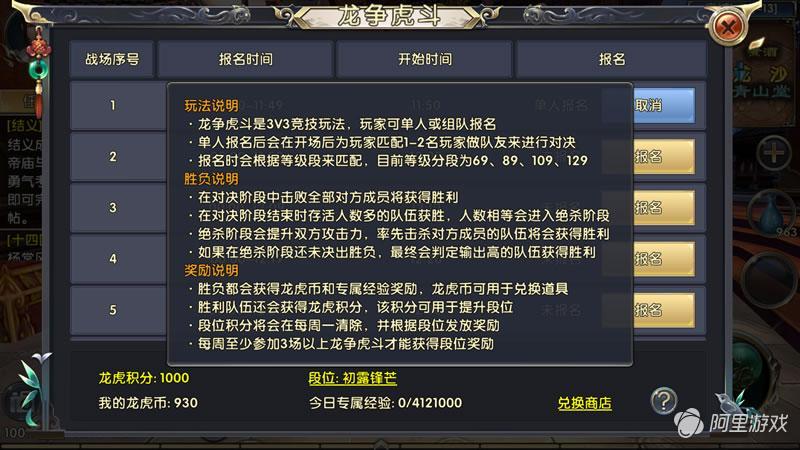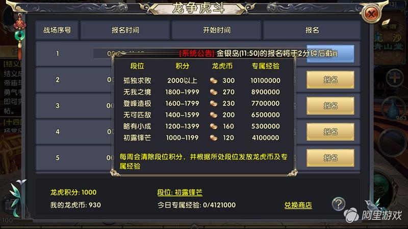 玩家每参加一场龙争虎斗,即可获得龙虎积分(失败了也有哦),龙虎积分越多,则竞技场段位越高,从初露锋芒到独孤求败,一共分为六个段位,每周会清楚段位积分,并根据所处段位发放龙虎币和专属经验,所以,大侠们一定要多多参与哦。
