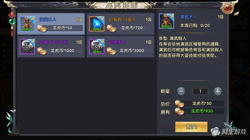 其二为龙虎币,龙虎币可用来在兑换商店兑换演武木人、装备打孔石以及炫酷时装,这些都是大侠们行走江湖必备的物品,尤其是装备打孔石,用处很多,出处较少,以龙虎积分兑换,是一个非常稳定的获取途径。