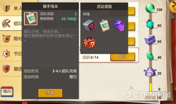 介绍:组队日常,闯关任务。每日道具制作材料的主要来源之一。每日7次。