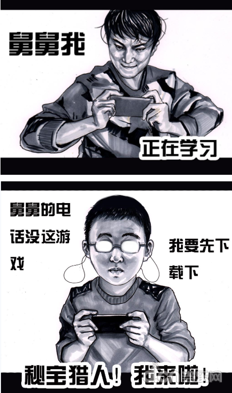 总能给左手韩带来出其不意的“惊喜”的大外甥,此次与舅舅左手韩上演斗智斗勇的戏码,一切只为在舅舅手机上痛痛快快地玩《秘宝猎人》。而后来的剧情也很跌宕起伏,原本因为外甥的恶作剧悲伤不已的左手韩,竟然因为《秘宝猎人》太有魅力而忘记了爱情。如此峰回路转的剧情,加以左手韩特有的写实画风,想知道故事详情的话,还请移步网易秘宝猎人官方微信公众号一探究竟吧!