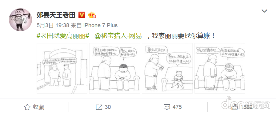 主打小夫妻日常,漫画形式写实的郊县天王老田也首次在作品中引入了游戏这一元素。《秘宝猎人》的火爆已蔓延到了曾在往期老田的漫画中出现多次的早点摊。摊主都在玩《秘宝猎人》,压根没有心思出摊做生意。无独有偶,女主角高丽丽惊讶地发现老田、宠物猫鲁班和母亲都陶醉在秘宝世界中无心理会她。于是才有了微博中“秘宝猎人,我家丽丽要找你算账”的喊话。