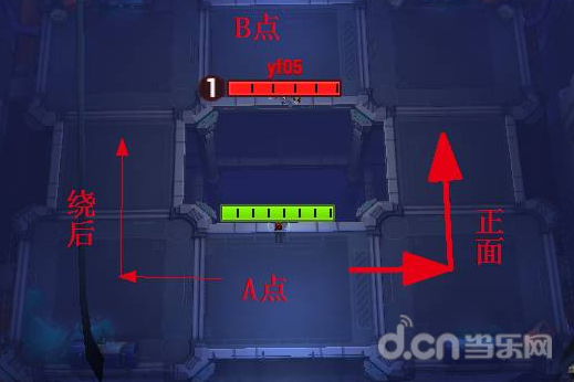 地形:可以看到环形场地是一个对称的场地,其中A点是己方出生点,B点是敌方出生点。明显此场地是一个首尾相接的场地,一个好的远程可以有几乎无穷的空间去风筝近战。而刺客型的角色也可以秘密地接近敌方后排,进行偷袭。